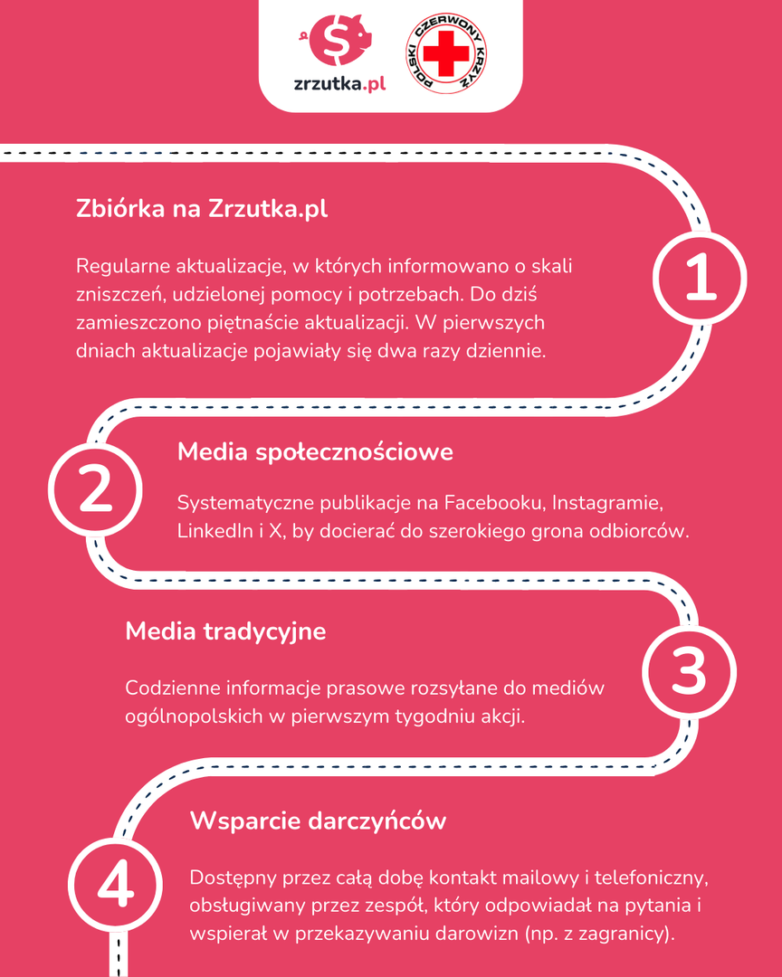Budowanie zainteresowania i zaufania darczyńców to długi proces i kluczowa jest tutaj komunikacja i raportowanie postępów. Pomocne jest pokazywanie historii ludzi, na których poprawę losu miała wpływ darowizna. Pozyskiwanie takich relacji wymaga dużo pracy. Musimy mieć w terenie osoby od komunikacji, które wiedzą, jak rozmawiać z poszkodowanymi. Ta wiarygodność i transparentność jest ważna, aby pokazać darczyńcy, że liczy się każda złotówka, że ma wpływ, że słusznie nam zaufał, bo my w PCK wiemy, jak pomagać.