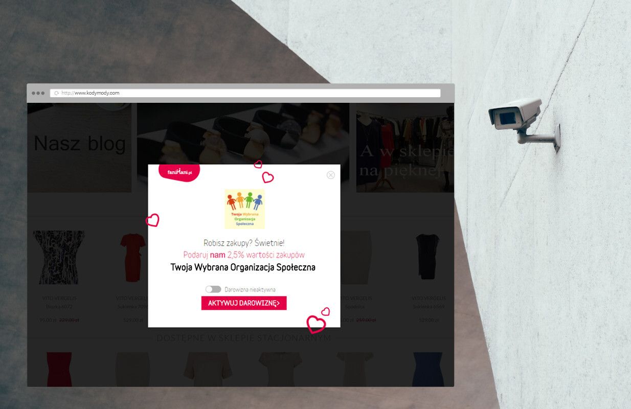 Po kliknięciu w link aktywujący darowiznę wszystko dzieje się już na stronie FaniMani.pl, tak samo jak w przypadku przejścia z podstrony Partnera w serwisie FaniMani. Tam sprawdzamy, czy Użytkownik jest zalogowany, i którą Organizację wspiera, i generujemy link do Sklepu ze specjalnym identyfikatorem, który pozwala naliczyć darowiznę po sfinalizowaniu zamówienia.