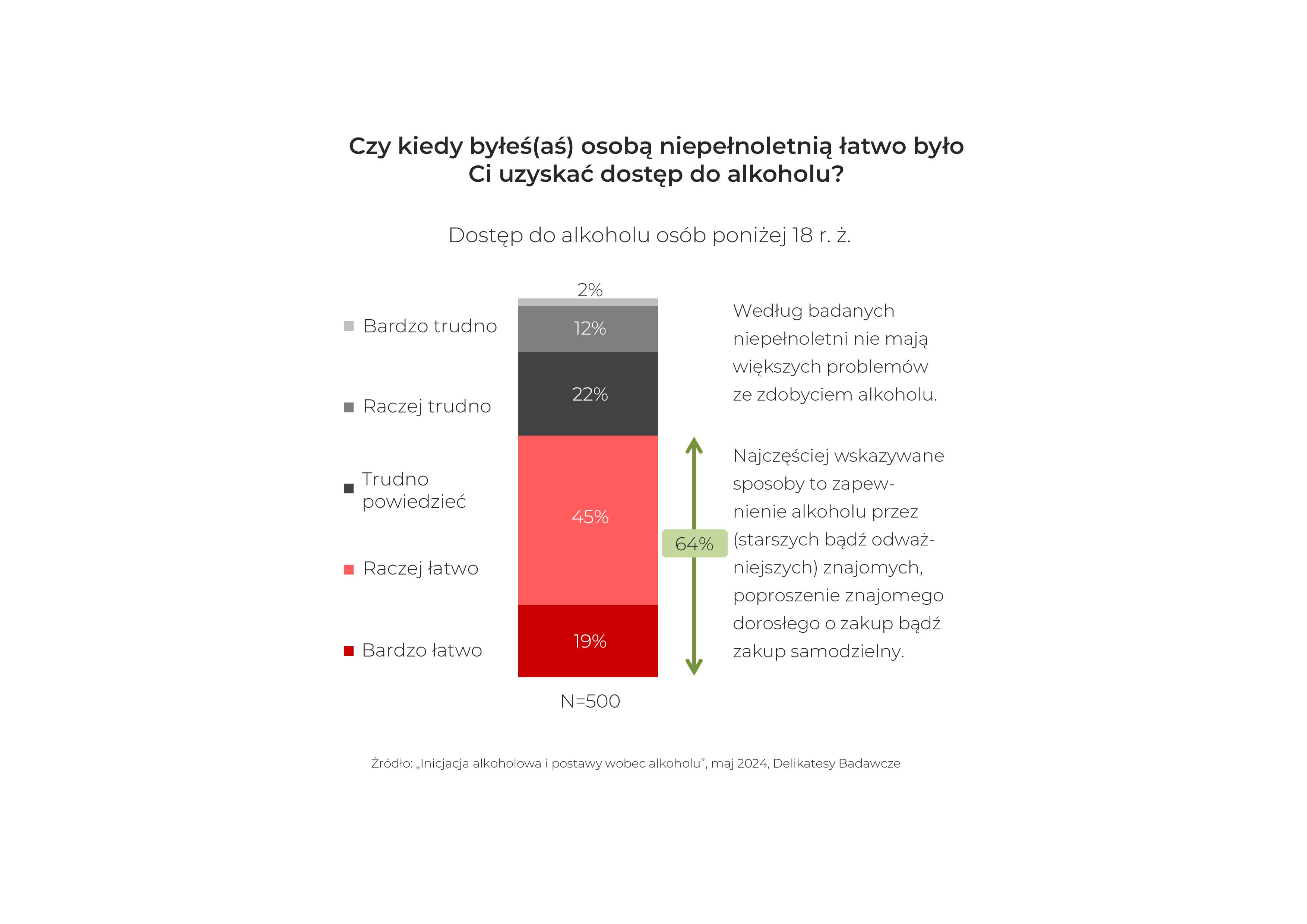 Pomimo obowiązującego w Polsce zakazu sprzedaży napojów alkoholowych osobom poniżej 18. roku życia, niepełnoletnia młodzież nie ma problemu, by je zdobyć. 64 proc. respondentów badania ICŚ wskazało, że napoje alkoholowe były dla nich łatwe do kupienia, zanim osiągnęli pełnoletniość. 31 proc. z nich podejmowało samodzielne i udane próby ich zakupu w sklepach. Respondenci badania ICŚ, podobnie jak uczestnicy ESPAD, potwierdzają̨, że dla nastolatków najłatwiejszym do kupienia napojem alkoholowym jest piwo.