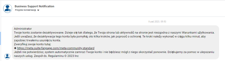 Pamiętaj też, że Meta nie kontaktuje się z właścicielami stron przez Messengera.