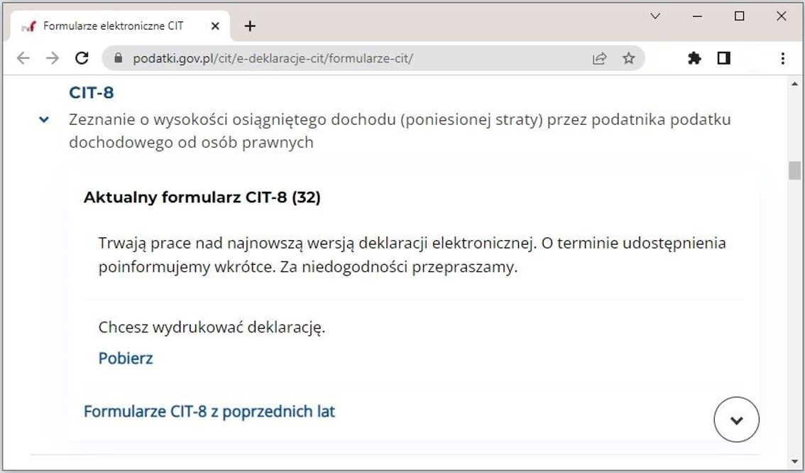 UWAGA: W chwili publikacji tego materiału (koniec marca) w serwisie podatki.gov.ple dostępna jest najnowsze wersja deklaracji: wersja 32 - pod adresem https://www.podatki.gov.pl/cit/e-deklaracje-cit/formularze-cit/. Niestety jest to wersja przygotowana tylko do wydrukowania i nie umożliwia ona wysyłki elektronicznej (nie jest edytowalna).