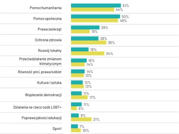 Badani dostrzegają przede wszystkim zaangażowanie organizacji pozarządowych w pomoc humanitarną (51%) i społeczną (50%). Na trzecim miejscu wskazują działania na rzecz praw zwierząt (29%). Warto pamiętać, że mowa tu nie tyle o rzeczywistym zaangażowaniu organizacji w poszczególne obszary, co raczej o widoczności tych działań. Widoczności będącej zarówno efektem świadomych i zamierzonych działań komunikacyjnych, jak i mechanizmów przestrzeni medialnej, które z większym prawdopodobieństwem nagłaśniają emocjonalne czy spektakularne akcje niż codzienną, żmudną pracę na rzecz rozwiązywania problemów społecznych.