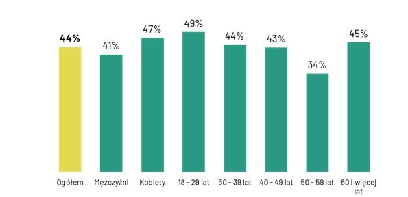Kobiety częściej w porównaniu do mężczyzn są przekonane o tym, że działania NGOsów przynoszą konkretne zmiany (51% vs 43%), natomiast osoby w wieku 30-39 lat są najbardziej sceptyczne – jedynie 40% uważa, że organizacje pozarządowe skutecznie rozwiązują ważne problemy społeczne w Polsce, a niemal tyle samo (39%) jest przeciwnego zdania. Co zaskakujące, w grupie tej 44% osób – tak jak i w całej badanej populacji – deklaruje, że w swoim najbliższym otoczeniu dostrzega zmiany będące skutkiem działań organizacji pozarządowych. Najrzadziej takie efekty dostrzegają osoby w wieku 50-59 lat (34%), najczęściej – osoby najmłodsze (49%). Wskazuje to na konieczność podkreślania przez organizacje lokalnego wymiaru prowadzonych działań i lepszego dotarcia z komunikacją do starszych grup wiekowych.