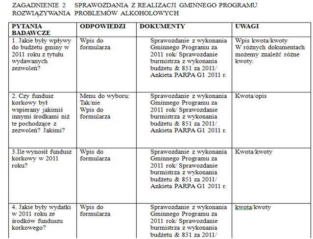 Przygotuj instrukcję dla osób, które mają korzystać z narzędzia i wprowadzać dane. Najlepiej umieścić w narzędziu dwa rodzaje instrukcji – jedną ogólną, w formie przewodnika mówiącego, jak korzystać z całego narzędzia i drugą, podzieloną na wskazówki dotyczące szukania odpowiedzi na każde pytanie zawarte w formularzu do prowadzenia monitoringu. Wskazówki warto przygotowywać równolegle z tworzeniem narzędzia. Wpisz tam, w jakiej formie chcesz uzyskać odpowiedź. Dodaj podpowiedzi np. gdzie można szukać źródeł informacji. Możesz wpisywać fragmenty ustaw, które regulują zagadnienie, o którym piszesz.