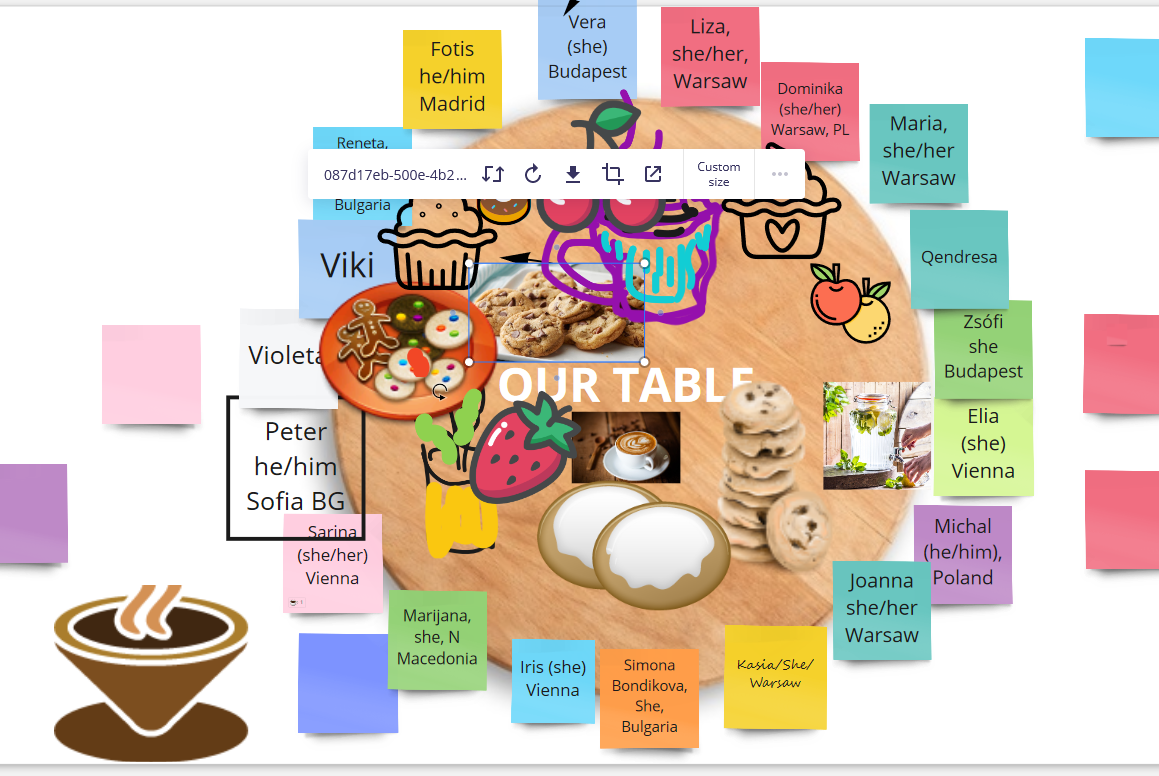 - Jeśli zamierzacie korzystać z innych narzędzi do współpracy, zapoznanie to dobry moment na pokazanie, jak go używać. Np. w Miro możecie stworzyć stół i poprosić uczestników, aby zapisali swoje imię i nazwę organizacji na wirtualnej kartce i „usiedli” przy stole. Opowieść zaczyna jedna osoba, a potem rundka idzie w lewo lub w prawo, dopóki wszyscy się nie przedstawią.