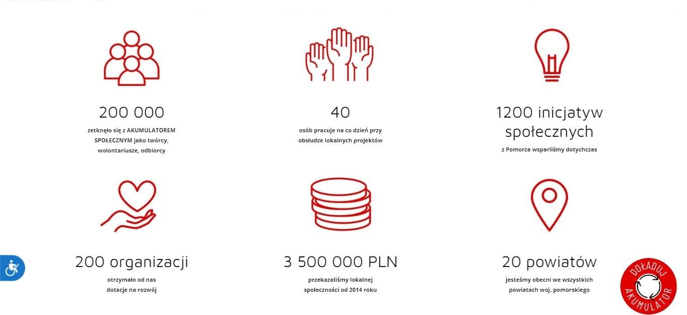 Podam przykład strony internetowej Akumulatora Społecznego. Jej czytelnikami i czytelniczkami są w większości mieszkańcy Pomorza ubiegający się o mikrogranty na działania społeczne. Przede wszystkim wchodzą na www, by „zrealizować pomysł”. Jak widać poniżej, mogą to być zarówno hafciarki z Pucka, jak i studenci z Gdyni, którzy drukują na drukarce 3D przybory dla osób niewidomych. Do tej komunikacji, naturalnej dla inicjatywy, która zajmuje się wspieraniem innych inicjatyw, jest dodana informacja, że można „doładować akumulator”. Pojawia się więc element fundraisingu, zachęta do działania.