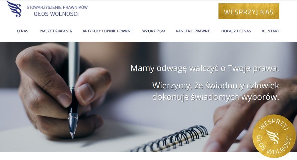 Informacji, co robicie, powinno towarzyszyć zaproszenie do zaangażowania finansowego. Można zobaczyć w przykładach zrzutów stron zamieszczonych powyżej, że apel o wsparcie jest umieszczany nie tylko na stronach zaprojektowanych pod zbiórki pieniędzy. Wpisujemy go również w projekty standardowych stron fundacji i stowarzyszeń. Zwyczajowo umieszczamy przycisk z hasłem, np. „Wesprzyj nas”/„Wspieram”/„Wpłać”/„Przekaż darowiznę” w prawym górnym rogu strony. Natomiast warto dodać wezwanie jeszcze w jakimś innym miejscu na www – np. tak, jak na stronie www Stowarzyszenia Prawników Głos Wolności.