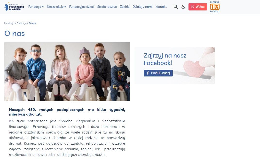Fundacja ma pod opieką 450 podopiecznych, którzy potrzebują stałego leczenia. Jeśli chcesz więcej się o tym dowiedzieć, zapraszam do odsłuchania webinarium z udziałem dyrektor „Przyszłość Dla Dzieci” Iwony Żochowskiej-Jabłońskiej: Cztery pory roku. Jak moja NGO wdrożyła fundraising? Materiały po webinarium ngo.pl [film]