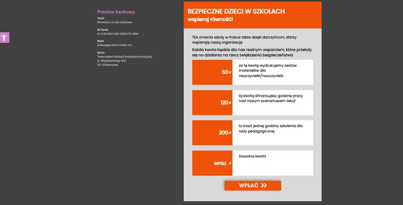 W poprzednim punkcie mówiłam, że dobrze by na stronie głównej Waszej organizacji znalazł się przycisk z hasłem „Wesprzyj nas”/„Wspieram”/„Wpłać”/„Przekaż darowiznę”. Teraz warto zastanowić się, do czego ma przekierowywać.