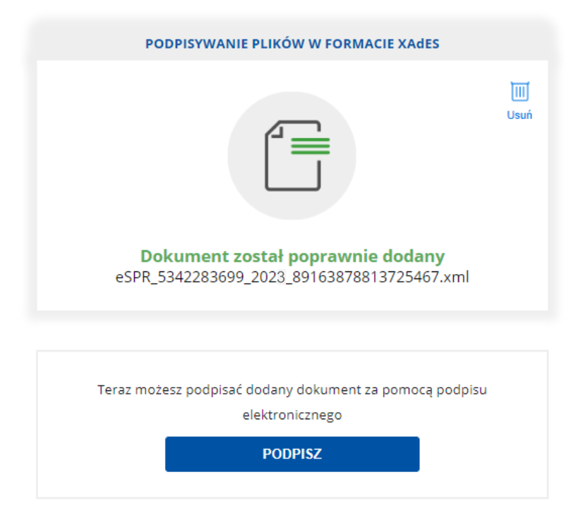 Ostania osoba z zarządu, po podpisaniu pliku według przedstawionych wskazówek, zapisuje ostateczny plik ze wszystkimi podpisami na dysku. Warto zrobić kopię tego pliku i zamieścić we wcześniej utworzonym folderze „sprawozdanie finansowe_2023”. Plik jest przygotowany w postaci .xml i zawiera treść dokumentu oraz wszystkie złożone podpisem zaufanym podpisy.