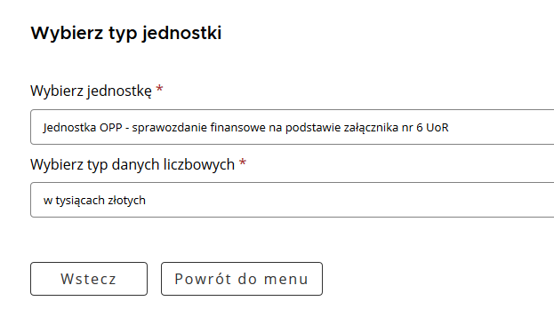Zanim jednak zaczniemy wpisywać liczby w poszczególne pola aplikacji, trzeba wybrać typ jednostki: wybieramy „jednostka OPP – sprawozdanie finansowe na podstawie załącznika nr 6” i nie ma znaczenia, czy mamy, czy też nie mamy statusu OPP, dla nas ważny jest załącznik nr 6.