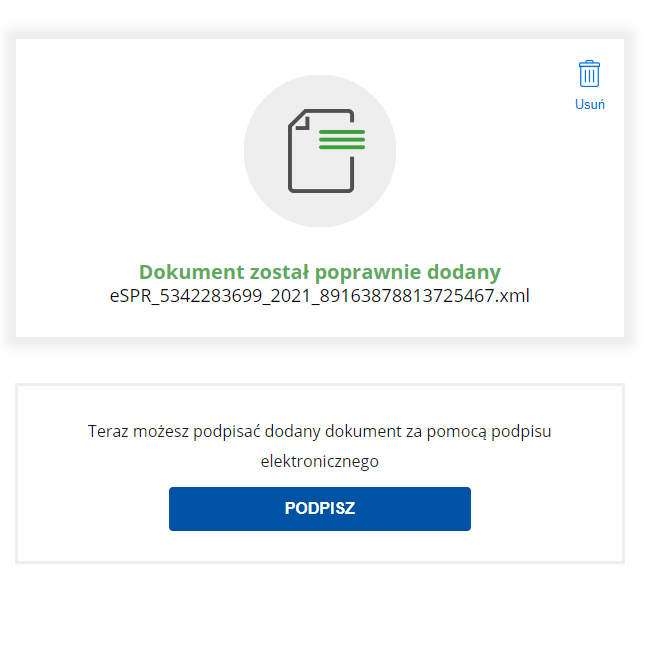 Ostania osoba z zarządu, po podpisaniu pliku według przedstawionych wskazówek, zapisuje ostateczny plik ze wszystkimi podpisami na dysku. Warto zrobić kopię tego pliku i zamieścić we wcześniej utworzonym folderze „sprawozdanie finansowe_2021”. Plik jest przygotowany w postaci .xml i zawiera treść dokumentu oraz wszystkie złożone podpisem zaufanym podpisy.