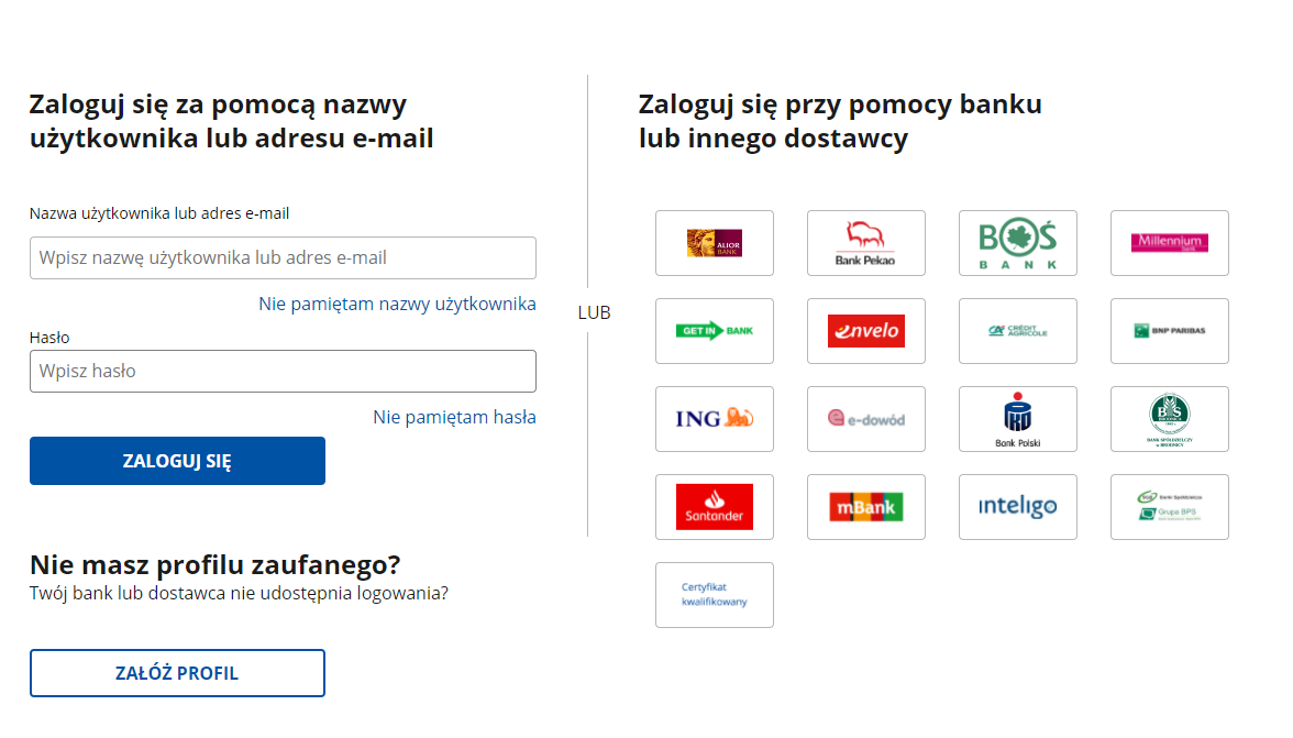 - zaloguj się, w wybrany przez siebie sposób (np. przez bankowość elektroniczną)