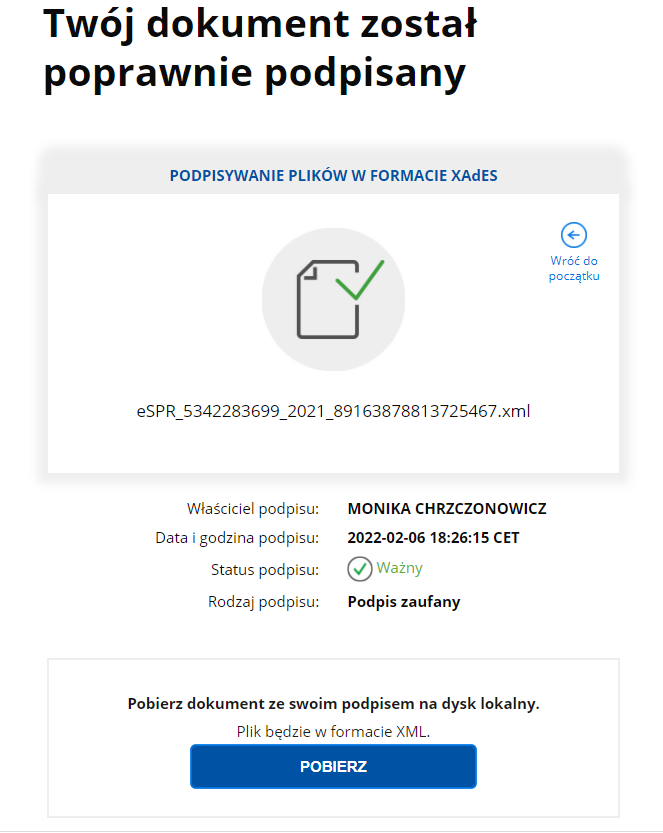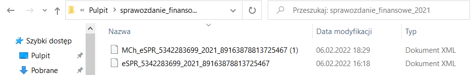 Plik zostanie zapisany na twoim dysku (u ciebie w komputerze) w postaci pliku z rozszerzeniem „xml” , znajdziesz go w folderze „pobrane”, najlepiej przenieść go do utworzonego wcześniej folderu „sprawozdanie finansowe_2021”, gdzie jest już zapisany plik wygenerowany z aplikacji, plik z twoim podpisem ma taką samą nazwę z małą „(1)” na końcu – możesz dla odróżnienia dodać swoje inicjały.