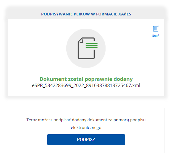 Ostania osoba z zarządu, po podpisaniu pliku według przedstawionych wskazówek, zapisuje ostateczny plik ze wszystkimi podpisami na dysku. Warto zrobić kopię tego pliku i zamieścić we wcześniej utworzonym folderze „sprawozdanie finansowe_2022”. Plik jest przygotowany w postaci .xml i zawiera treść dokumentu oraz wszystkie złożone podpisem zaufanym podpisy.