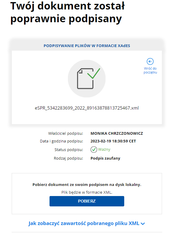 Plik zostanie zapisany na twoim dysku (u ciebie w komputerze) w postaci pliku z rozszerzeniem „xml” , znajdziesz go w folderze „pobrane”, najlepiej przenieść go do utworzonego wcześniej folderu „sprawozdanie finansowe_2022”, gdzie jest już zapisany plik wygenerowany z aplikacji, plik z twoim podpisem ma taką samą nazwę z małą „(1)” na końcu – możesz dla odróżnienia dodać swoje inicjały.