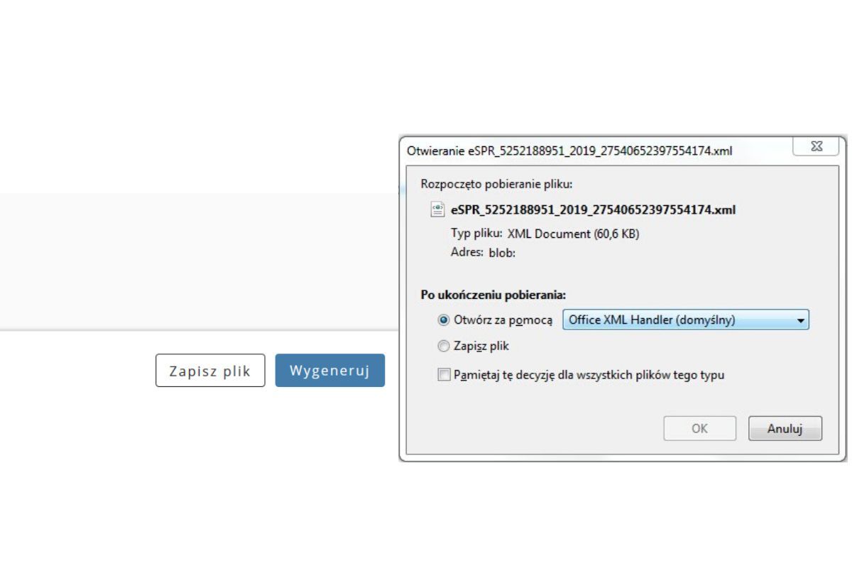 Na ekranie kliknij „zapisz plik”. Pojawi się okno z plikiem. Nazwa pliku jest generowana automatycznie i ma rozszerzenie .xml. Zapisz ten plik u siebie w komputerze (możesz zmienić nazwę, ale zostaw rozszerzenie .xml).
