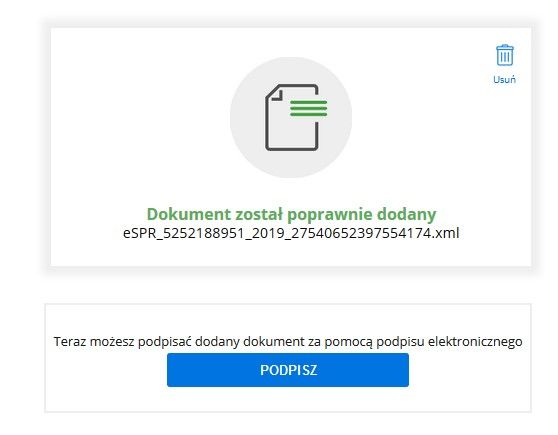 Ostania osoba z zarządu, po podpisaniu pliku według przedstawionych wskazówek, zapisuje ostateczny plik ze wszystkimi podpisami na dysku. Warto zrobić kopię tego pliku i zamieścić we wcześniej utworzonym folderze „sprawozdanie finansowe_2019”. Plik jest przygotowany w postaci .xml i zawiera treść dokumentu oraz wszystkie złożone podpisem zaufanym podpisy.