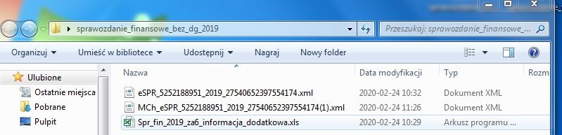 Plik zostanie zapisany na twoim dysku (u ciebie w komputerze) w postaci pliku z rozszerzeniem „xml” , znajdziesz go w folderze „pobrane”, najlepiej przenieść go do utworzonego wcześniej folderu „sprawozdanie finansowe_2019”, gdzie jest już zapisany plik wygenerowany z aplikacji, plik z twoim podpisem ma taką samą nazwę z małą „(1)” na końcu – możesz dla odróżnienia dodać swoje inicjały.