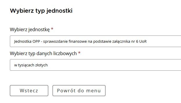 Zanim jednak zaczniemy wpisywać liczby w poszczególne pola aplikacji, trzeba wybrać typ jednostki. Wybieramy „jednostka OPP – sprawozdanie finansowe na podstawie załącznika nr 6” i nie ma znaczenia, czy mamy, czy też nie mamy statusu OPP – dla nas ważny jest załącznik nr 6.