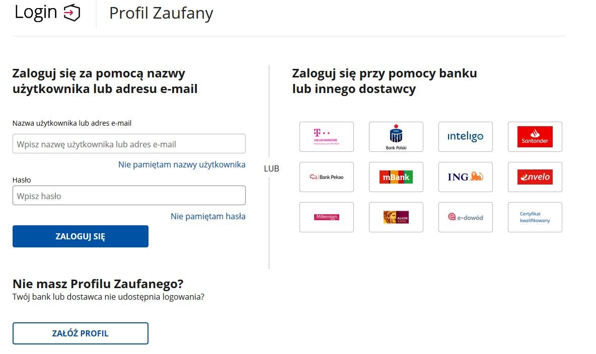 - zaloguj się, w wybrany przez siebie sposób (np. przez bankowość elektroniczną)