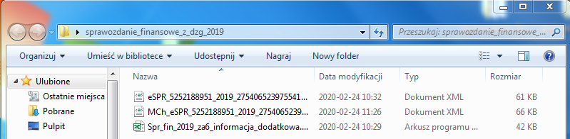 Plik zostanie zapisany na twoim dysku (u ciebie w komputerze) w postaci pliku z rozszerzeniem „xml” , znajdziesz go w folderze „pobrane”, najlepiej przenieść go do utworzonego wcześniej folderu „sprawozdanie finansowe_2019”, gdzie jest już zapisany plik wygenerowany z aplikacji, plik z twoim podpisem ma taką samą nazwę z małą „(1)” na końcu – możesz dla odróżnienia dodać swoje inicjały.