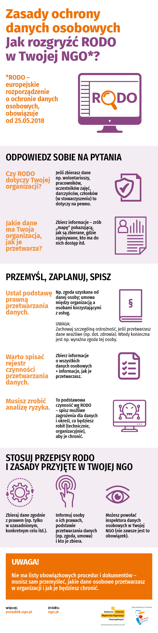 Pamiętaj, że RODO to temat obszerny. Infografika jest jedną z pomocy pozwalających lepiej go zgłębić. Nie możesz jednak na tym poprzestać. Koniecznie zobacz jeszcze inne materiały dotyczące RODO zebrane w poradnik.ngo.pl i systematycznie pogłębiaj swoją wiedzę.
