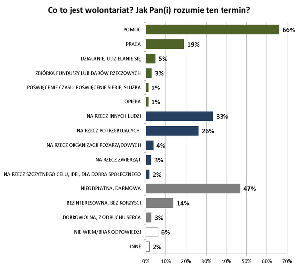 Stowarzyszenie Klon/Jawor zadało pytanie, jak należy rozumieć wolontariat. Badani mogli zaproponować własną definicję. Wskazywali przy tym na trzy wymiary zjawiska: rodzaj aktywności, odbiorców działań oraz rozmaite określenia, które charakteryzowały wolontariat.