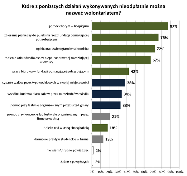 Badani zostali również poproszeni o wskazanie działań, które ich zdaniem można określić jako przykłady wolontariatu. Okazuje się, że 87 proc. ankietowanych godzi się ze stwierdzeniem, że wolontariatem jest pomoc chorym w hospicjum. Największa liczbę wskazań dostały aktywności związane z pomaganiem – nie tylko przez wsparcie finansowe – osobom chorym, niepełnosprawnym i potrzebującym, a także opieka nad zwierzętami.