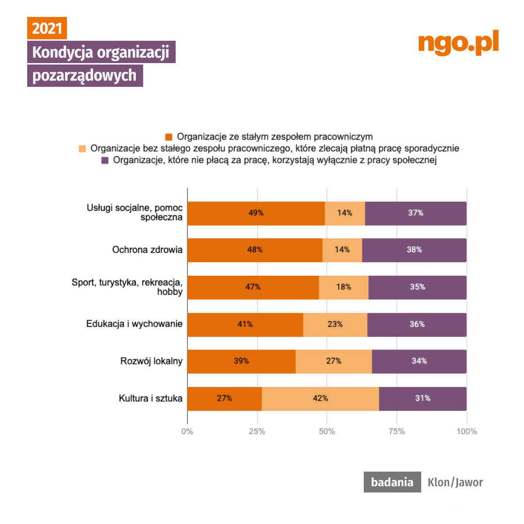 Z badań Klon/Jawor wynika, że 41% organizacji płaci za pracę stale i regularnie (co najmniej raz w tygodniu). Ponad połowa organizacji posiadających tak rozumiany stały, płatny zespół (22% wszystkich NGO) przynajmniej jedną osobę zatrudnia na podstawie umów o pracę, a pozostałe (19% wszystkich NGO) korzystają ze stałej i regularnej pracy osób pracujących wyłącznie na podstawie umów cywilnoprawnych.
