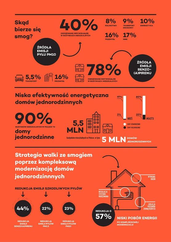 Dokument stanowi kompendium wiedzy na temat przyczyn i skutków smogu oraz przedstawia wyniki badania polegającego na zasymulowaniu kompleksowej modernizacji domów jednorodzinnych. Badanie to pokazuje redukcję zużycia energii i tym samym zmniejszenie emisji benzo(a)piernu, pyłów PM2,5 i PM10, którą można osiągnąć poprzez podniesienie standardu energetycznego budynków jednorodzinnych w Polsce.