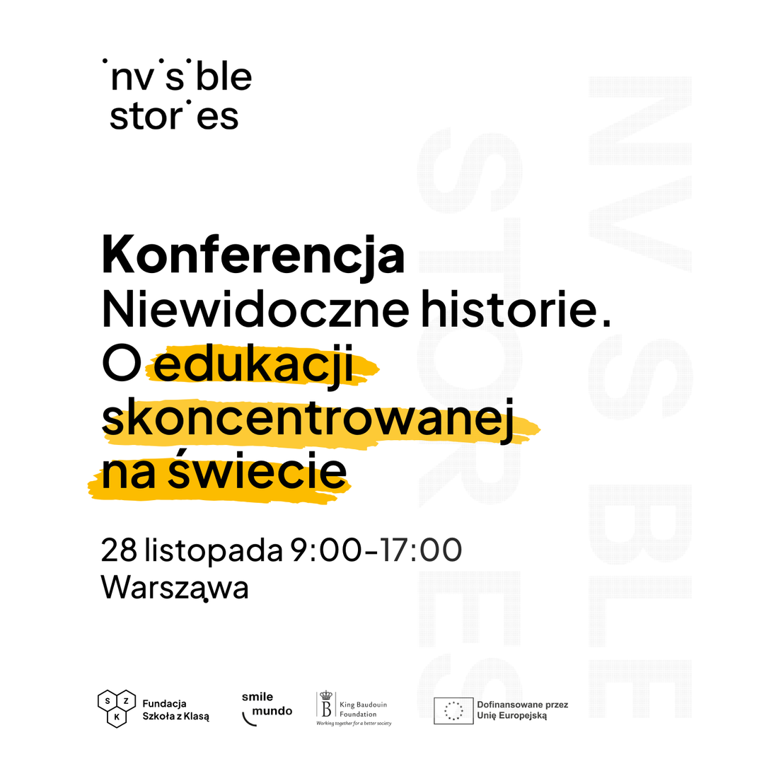 Realizowany w latach 2023-2025 program Niewidoczne historie wyposaża nauczycieli i nauczycielki, edukatorów i edukatorki w materiały dydaktyczne, które wspierają realizację podstawy programowej z edukacji obywatelskiej oraz prowadzenie zajęć geografii, historii, wiedzy o społeczeństwie czy lekcji wychowawczych. W programie promowane są innowacyjne metody nauczania, które zachęcają do refleksji i rozmów, oparte na cyfrowych narzędziach, grach edukacyjnych i narracjach osobistych oraz podejściu edukacji skoncentrowanej na świecie. Oferowane są w nim materiały przygotowywane są przez interdyscyplinarny, międzynarodowy zespół ekspertów i ekspertek z Fundacji Szkoła z Klasą z Polski, Smilemundo z Hiszpanii oraz King Baudouin Foundation z Belgii.