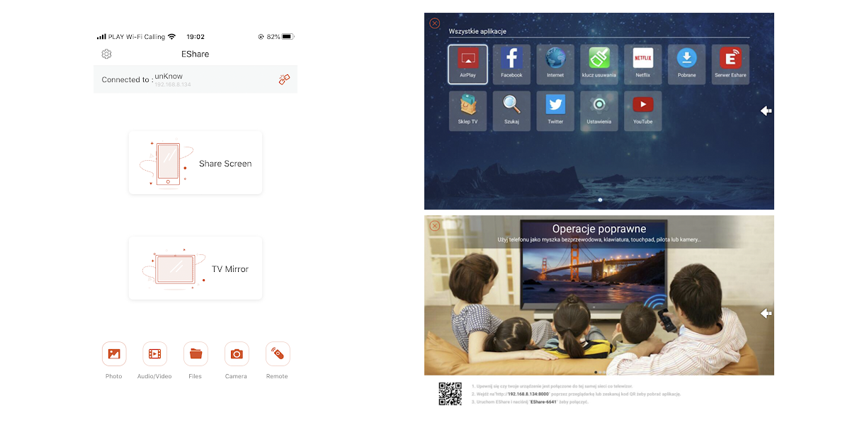 Poniżej przykład aplikacji EShare. Jak widać, umożliwia ona nie tylko strumieniowanie multimediów z telefonu, wyświetlanie podglądu z aparatu czy sterowanie telewizorem, ale również udostępnienie ekranu TV na smartfon.