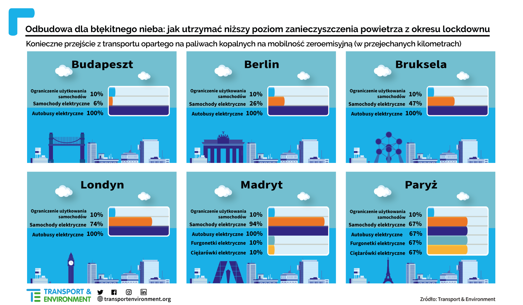Podczas pandemii w Brukseli, Londynie, Madrycie i Paryżu odnotowano gwałtowny spadek zanieczyszczenia komunikacyjnego dwutlenkiem azotu (NO2) o odpowiednio 43%, 54%, 71% i 76%. Zanieczyszczenie w Paryżu osiągnęło najniższy poziom od 40 lat, a mieszkańcy Mediolanu znów wyraźnie widzieli pobliskie Alpy. Utrzymanie tej zmiany pozwoli na uratowanie życia tysięcy osób i oszczędzi gospodarce miliardów euro kosztów związanych z rekompensowaniem wpływu zanieczyszczenia na życie i zdrowie Europejek i Europejczyków.