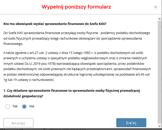 Otworzy Ci się formularz. Wypełnij go zgodnie z informacjami poniżej – tak więc w pierwszym pytaniu zaznacz odpowiedź „nie” i kliknij „dalej”.