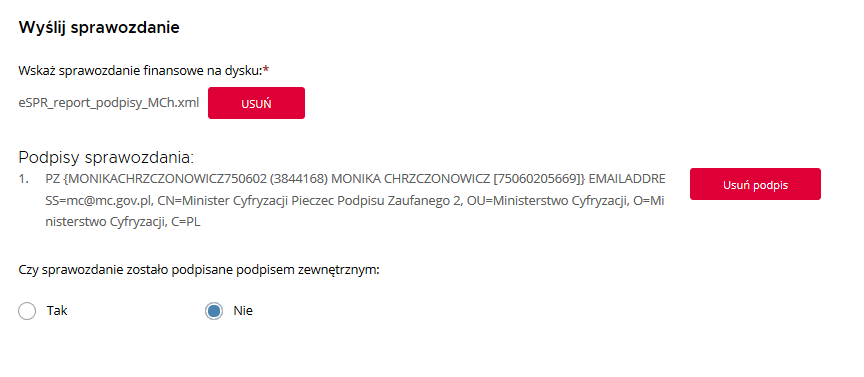Sprawozdanie dodane, uchwała o zatwierdzeniu sprawozdania dodana, zatem możesz kliknąć zielony przycisk „podpisz i wyślij”. Przekieruje Cię na stronę do podpisana za pomocą profilu zaufanego. Podpisz zgodnie z zasadami – dokumenty zostaną przesłane do szefa KAS.