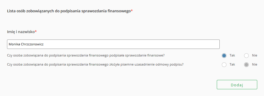 Następnie zjedź niżej i dodaj osoby, które są zobowiązane do podpisania sprawozdania. Wpisujesz imię i nazwisko, zaznaczasz odpowiedź na pytanie, czy osoba podpisała się pod sprawozdaniem czy też nie, a jeśli nie, to czy złożyła pisemne uzasadnienie odmowy podpisania sprawozdania, po czym klikasz „dodaj”.
