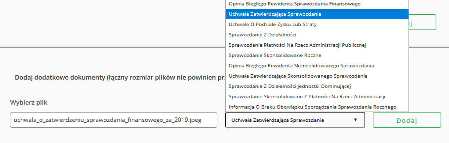 Kliknij w okno „wybierz plik”, z plików wybierz uchwałę zatwierdzającą sprawozdanie finansowe (podjętą zgodnie z zasadami obowiązującymi w danej organizacji). Z rozwijalnej listy wybierz informację, jaki dokument dołączasz: „uchwała zatwierdzająca sprawozdanie”, po czym kliknij „dodaj”.