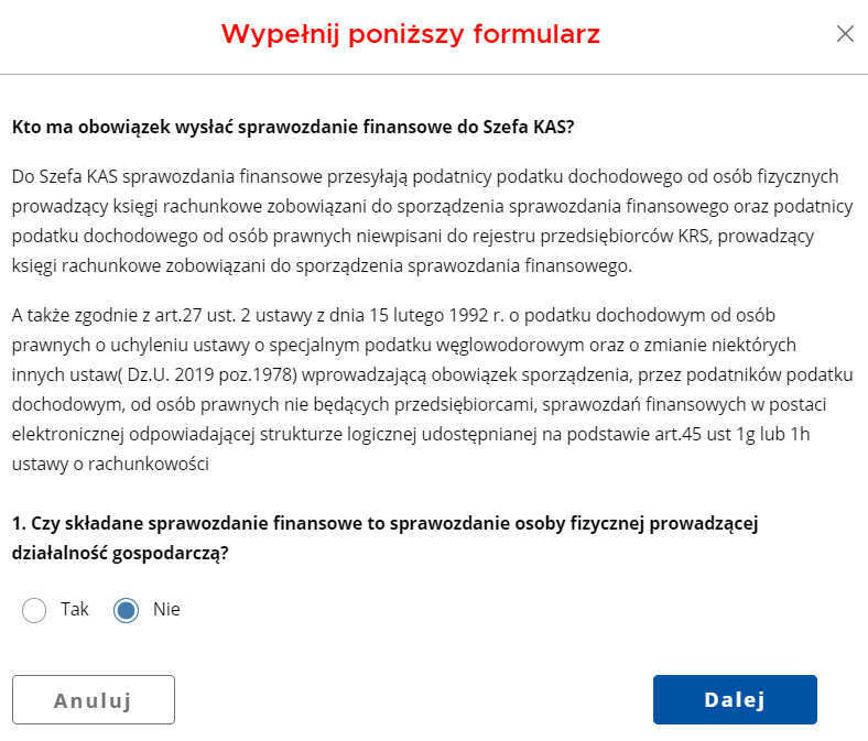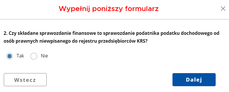 W drugim pytaniu 2. Czy składane sprawozdanie finansowe to sprawozdanie podatnika podatku dochodowego od osób prawnych niewpisanego do rejestru przedsiębiorców KRS? zaznacz „tak” i kliknij dalej.