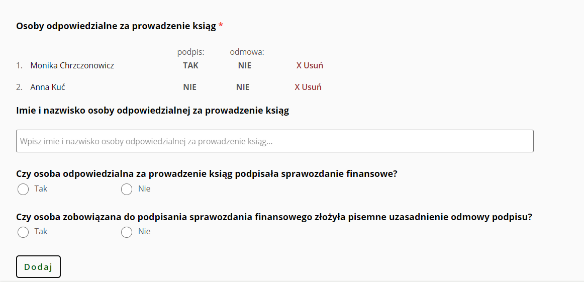 Następnie zjedź niżej i dodaj osoby, które są zobowiązane do podpisania sprawozdania (osoby odpowiedzialne za prowadzenie ksiąg czyli sporządzający sprawozdanie oraz wszystkie osoby z zarządu). Wpisujesz imię i nazwisko, zaznaczasz odpowiedzi na pytania, czy osoba podpisała się pod sprawozdaniem czy też nie. A jeśli nie, to czy złożyła pisemne uzasadnienie odmowy podpisania sprawozdania czy też nie po czym klikasz „dodaj”.