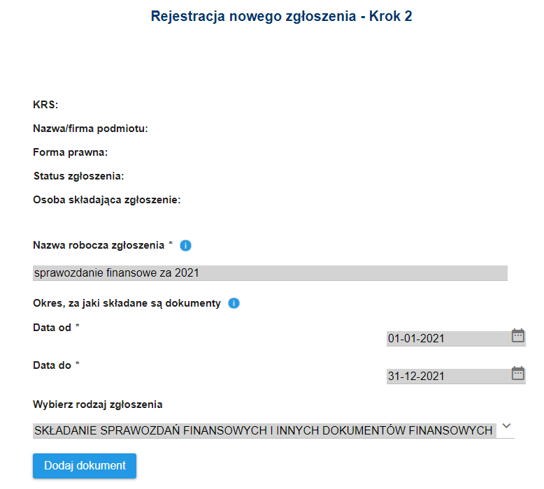 Kliknij przycisk „dalej”, twój kolejny krok to podanie informacji czego dotyczy twoje zgłoszenie. Podaj roboczą nazwę zgłoszenia – to nazwa dla Ciebie. Podaj okres za jaki składane są dokumenty czyli daty początku i końca roku obrotowego Twojej organizacji. Wybierz rodzaj zgłoszenia.