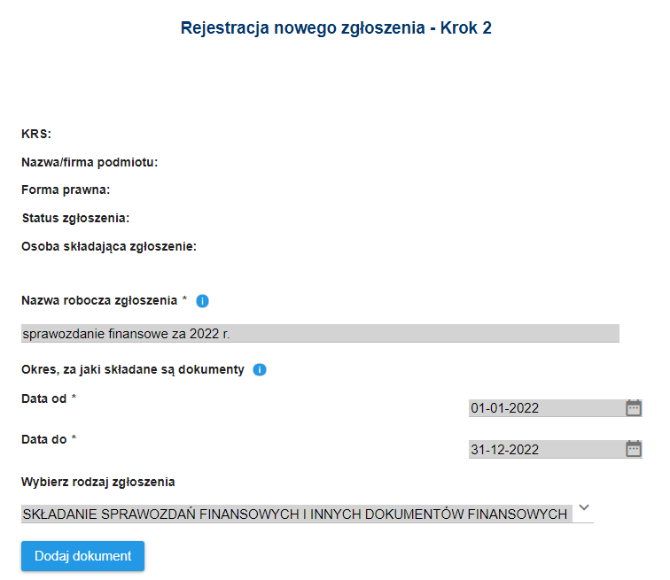 Kliknij przycisk „dalej”, twój kolejny krok to podanie informacji czego dotyczy twoje zgłoszenie. Podaj roboczą nazwę zgłoszenia – to nazwa dla Ciebie. Podaj okres za jaki składane są dokumenty czyli daty początku i końca roku obrotowego Twojej organizacji. Wybierz rodzaj zgłoszenia.