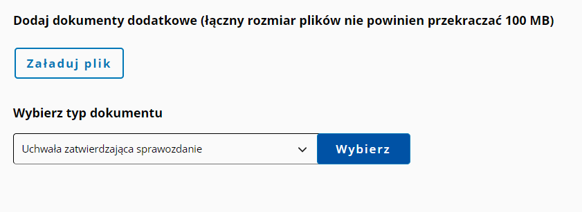 Kliknij w okno „wybierz plik”, z plików wybierz uchwałę zatwierdzającą sprawozdanie finansowe (podjętą zgodnie z zasadami obowiązującymi w danej organizacji). Z rozwijalnej listy wybierz informację, jaki dokument dołączasz: „uchwała zatwierdzająca sprawozdanie”, po czym kliknij „dodaj”.