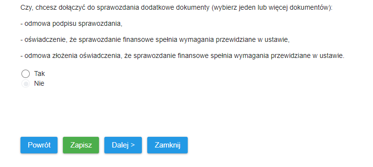 Zostaniesz przeniesiony do nowego ekranu z oświadczeniami z pytaniem, czy chcesz dołączyć dodatkowe dokumenty. UWAGA! Osoba może odmówić podpisania sprawozdania finansowego, taka odmowa jest sporządzana pisemnie i wymaga uzasadnienia.
