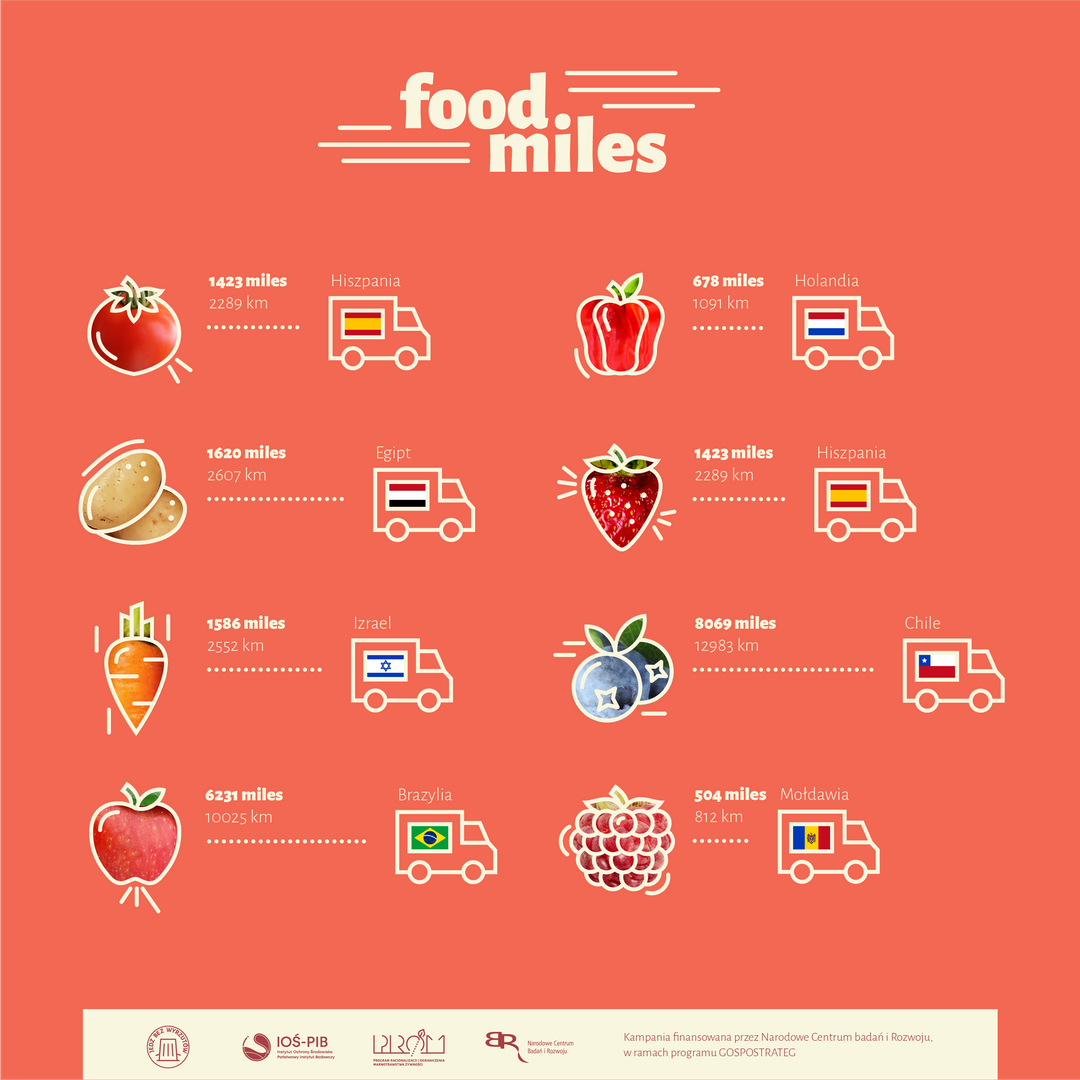 Odległość, jaką żywność musi pokonać od tzw. pola do stołu określa termin food miles. To istotny czynnik, który wpływa nie tylko na jakość produktów spożywczych i ich wartości odżywcze, ale również na stan środowiska naturalnego. Im dłuższa droga produktu z miejsca produkcji do miejsca konsumpcji, tym większe zanieczyszczenie środowiska spowodowane przez transport (emisja szkodliwych gazów do atmosfery, skażenie wody, hałas).