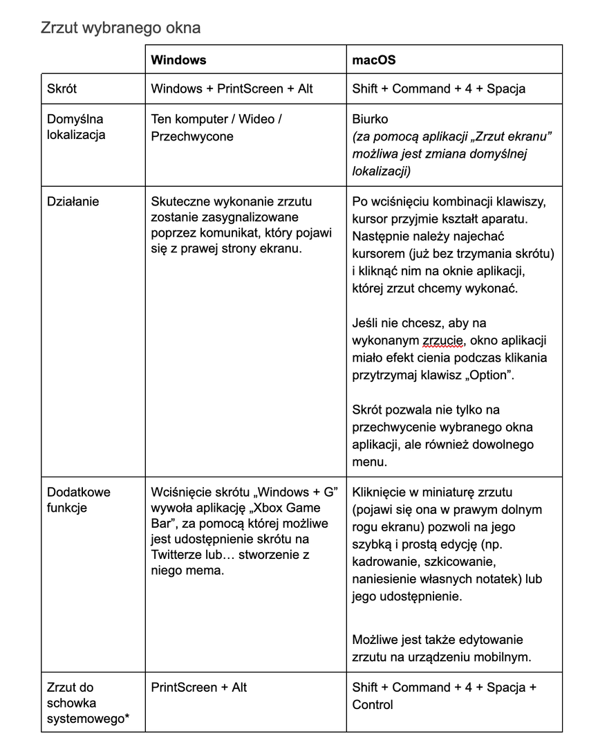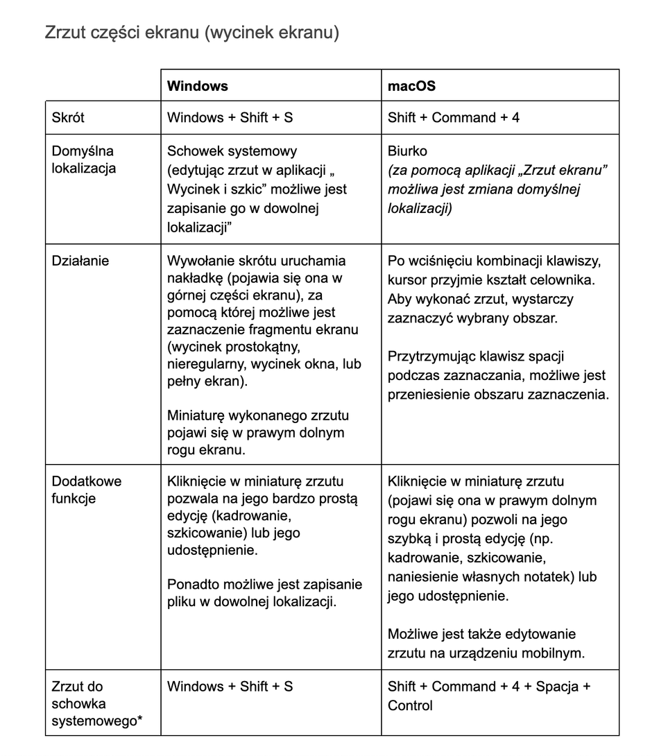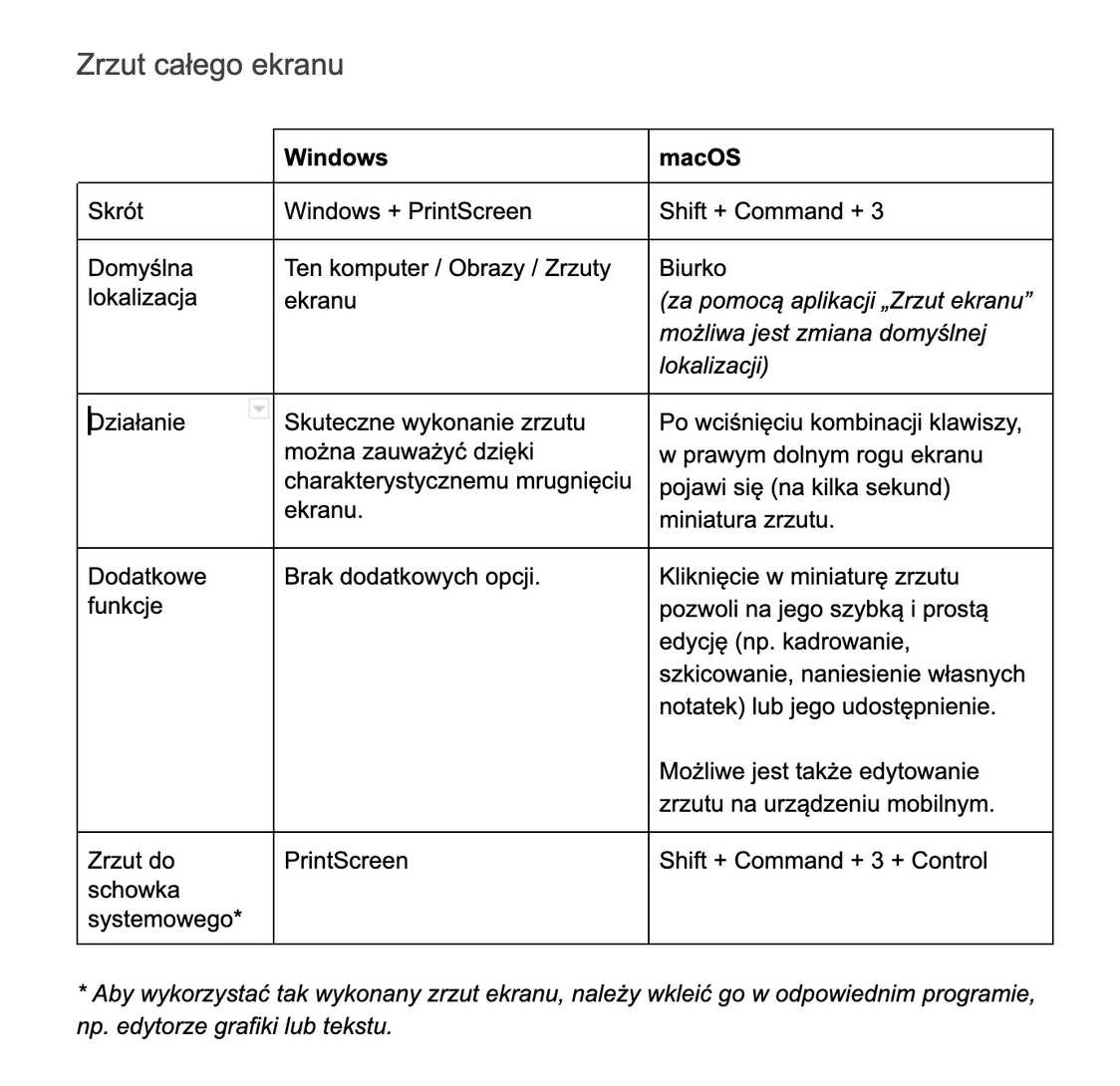 - jak wykonać zrzut ekranu w systemach operacyjnych Windows i macOS;