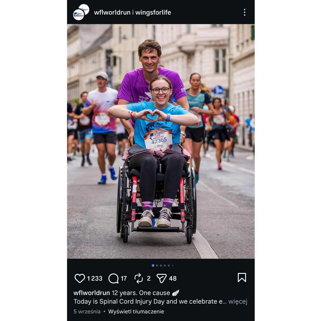 Celem organizacji pozarządowych jest w moim rozumieniu niesienie pomocy potrzebującym – doprowadzenie ich do tak pozytywnego stanu, jak to tylko możliwe. Myślę więc, że osoby chore warto pokazać tak, by dawały nadzieję innym, niekoniecznie potęgowały poczucie beznadziei. Dobrym przykładem jest inicjatywa Wings For Life, której celem jest zbieranie pieniędzy na badania nad sposobami leczenia przerwanego rdzenia kręgowego. Coroczny bieg cechuje się pozytywną atmosferą, którą widać na fotografiach.