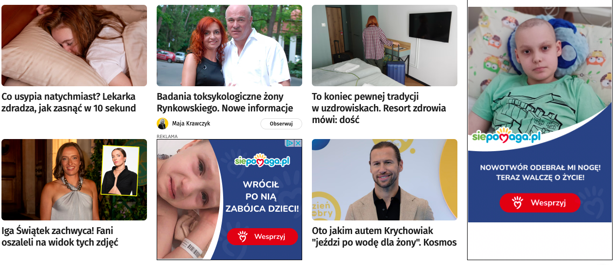 Korzystanie z performance marketingu, czyli publikowanie reklam takich jak wyżej, może być strzałem w stopę nie tylko z powodu treści komunikatu. Może rodzić pytania o finanse i przypuszczenia typu „reklama w ogólnopolskim serwisie kosztuje, skoro NGO stać na nią, to może nie jest tak potrzebująca, jak twierdzi?”. Kiedyś napisałem do jednej prozwierzęcej organizacji reklamującej się właśnie w takim miejscu, dostałem odpowiedź, że wydawcy użyczają swojej powierzchni tego typu organizacjom. Moje wątpliwości rozwiano, ale nie każdy o takiej współpracy na linii wydawca – organizacja społeczna wie.