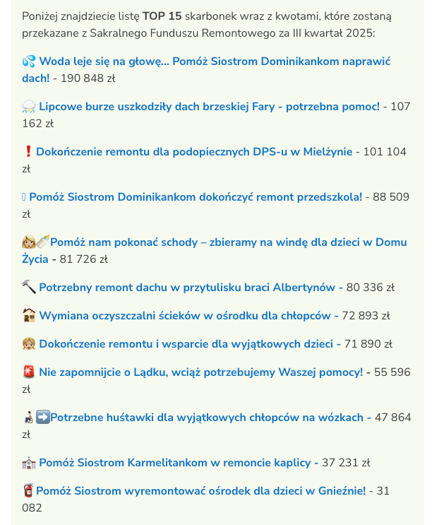 Moja pierwsza myśl dotyczy kościołów rozumianych jako budynki. Osobiście niekoniecznie wsparłbym tę inicjatywę. Ale po wejściu w zbiórkę widzimy już co innego. Listę konkretnych celów, w których dominuje pomoc podopiecznym organizacji kościelnych. Dla mnie różnica jest diametralna, podejrzewam, że dla wielu osób również. Może, zamiast zdjęcia kościoła, warto by pokazać podopiecznych DPS-u?