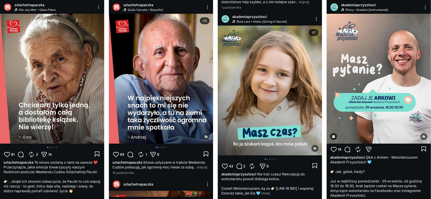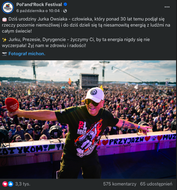 Świetnym przykładem organizacji, która zawsze (nie boję się użyć tego słowa) dba o uwzględnienie informacji o autorach wykorzystywanych przez siebie zdjęć jest WOŚP. Miałem okazję współprowadzić wiele jej kanałów social media (samej Fundacji, Kręcioły, Pol’and’Rock) i zawsze podpisywaliśmy fotografów, którzy robili dla nas zdjęcia. Używaliśmy nazwisk, ale też linkowaliśmy do ich fanpage’y czy kont na Instagramie, jeśli je posiadali.